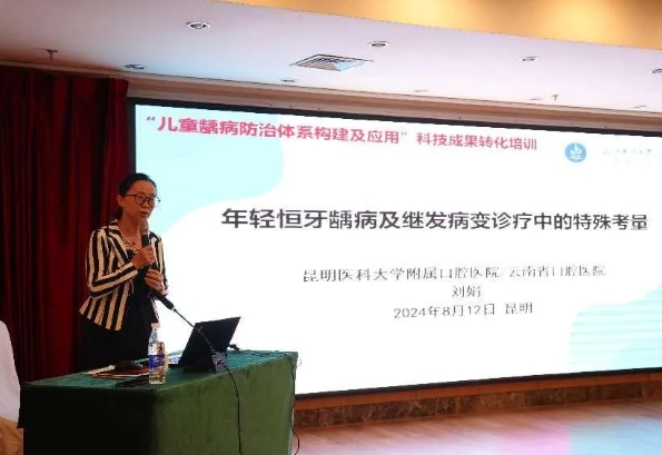 此次受邀培训的项目获2023年云南省卫生科技成果二等奖。在培训班上,儿童口腔医学专家刘娟教授作为项目主持人,带领儿童口腔科和预防科的全体团队成员,围绕儿童龋病防治相关问题作了临床新理念和新技术的授课培训,内容涵盖云南儿童口腔专业发展现状介绍、低龄儿童龋及年轻恒牙龋的预防及治疗、乳牙龋病常见治疗方法、活髓切断及预成冠修复、儿童口腔诊疗中的药物及非药物行为管理、人工智能技术在儿童口腔医学中的应用进展、龋病风险评估等十个专题。