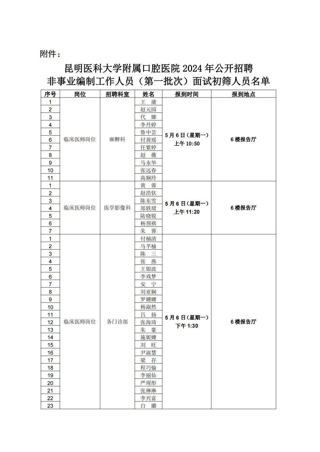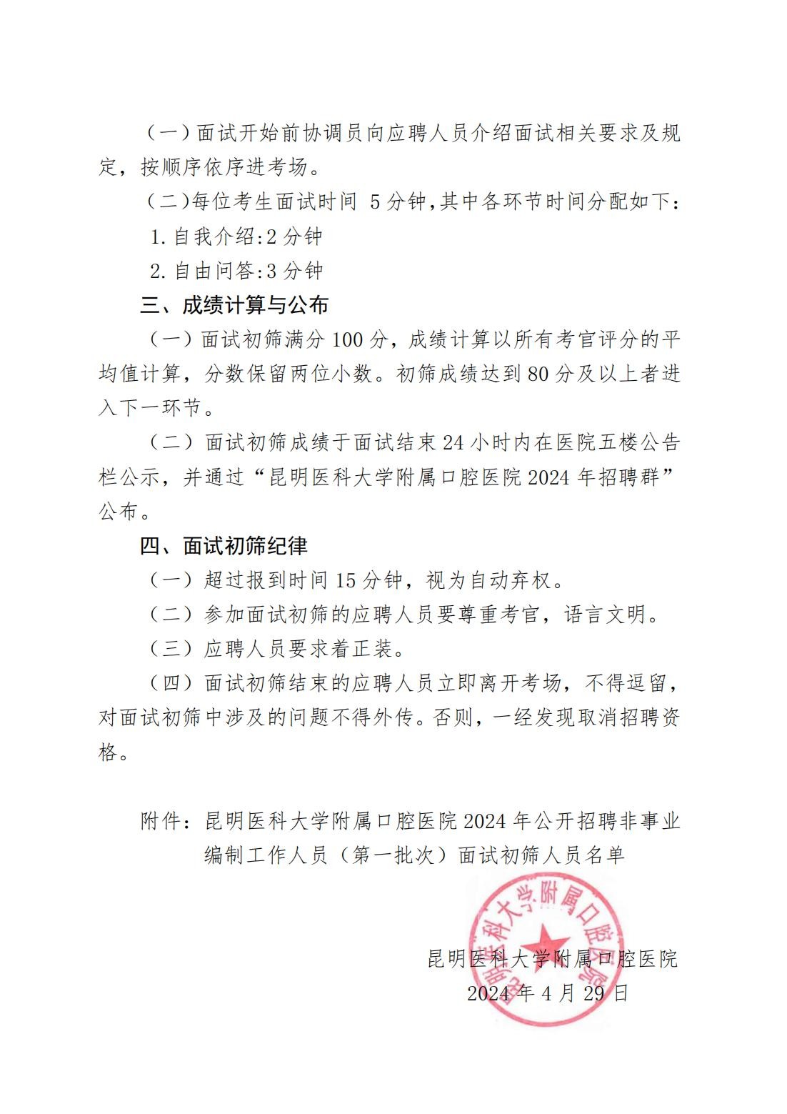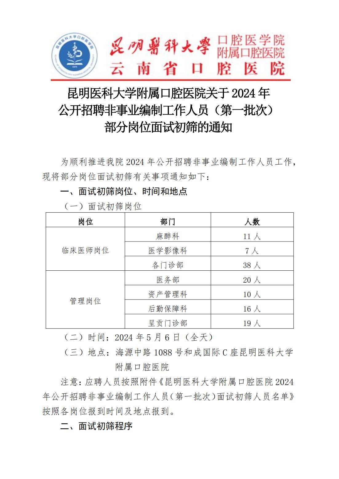 昆明医科大学附属口腔医院2024年公开招聘非事业编制工作人员(第一批次)面试初筛公告