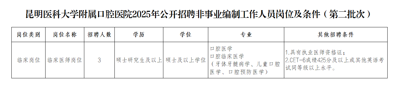 昆明医科大学附属口腔医院本次公开招聘非事业编制工作人员3名,具体招聘岗位及招聘条件如下: