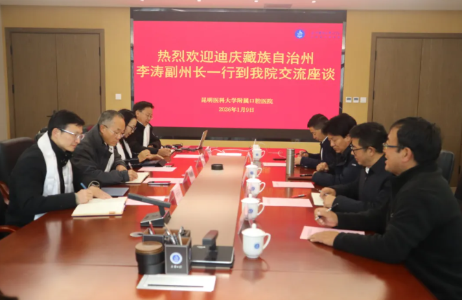 1月9日上午,迪庆藏族自治州(以下简称迪庆州)副州长李涛率队来院就口腔卫生健康对口帮扶工作进行会谈,双方表示,2026年将继续深化合作交流,推动优质口腔医疗资源下沉,助力提升迪庆州口腔医疗卫生服务能力。
